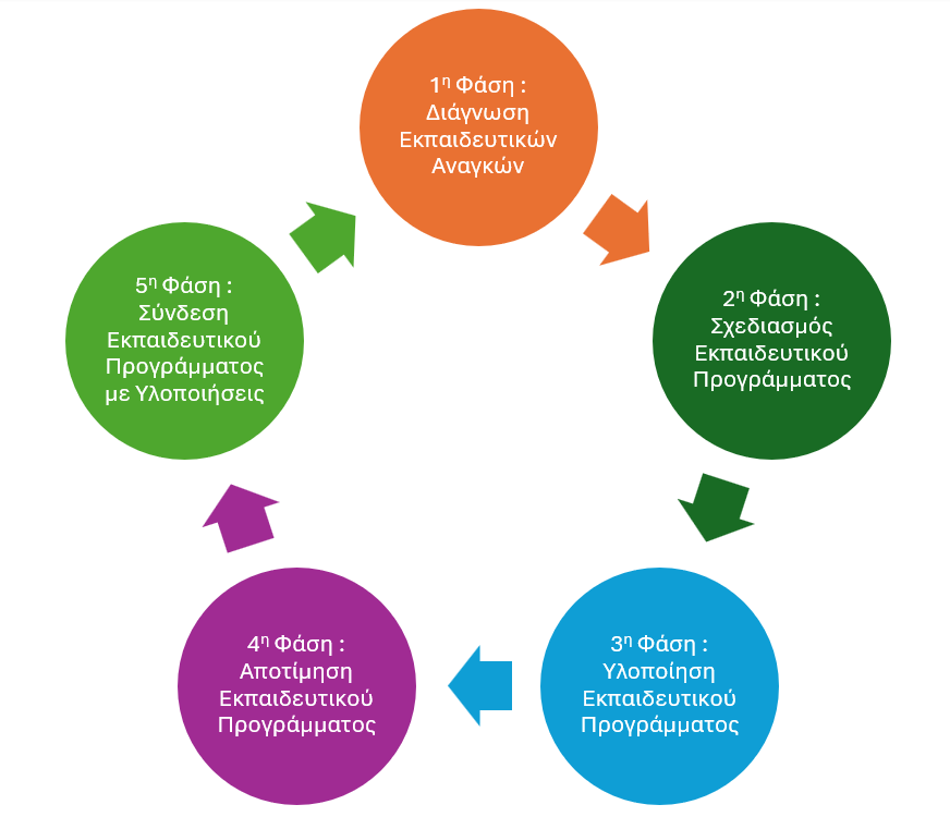 Το πρόγραμμα αναπτύσσεται σε 5 φάσεις οι οποίες μας βοηθούν να προσφέρουμε εξατομικευμένες εκπαιδευτικές υπηρεσίες που καλύπτουν τις ιδιαίτερες ανάγκες κάθε οργανισμού